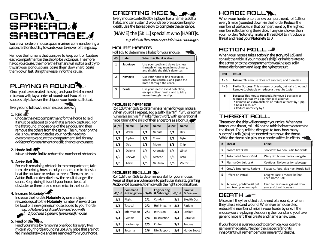 This game was inspired by the game "One Hundred Rats Devour a Tavern", by The Ravensridge Press, which is a free intro game as part of a larger rat destruction narrative. Please support Ravensridge and their awesome work!